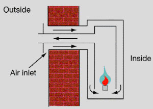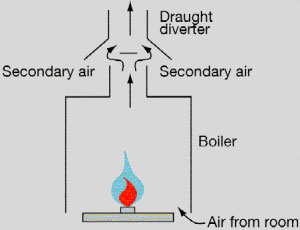 With a boiler having the type of flue, air for combustion is taken from the room in which the boiler is located. Flue products rise naturally and escape through a vent or chimney. The room must have a route for combustion air direct from outside.
