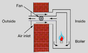 Open flue boilers are available wich have a small ‘flue fan’ to help to clear flue products. Exactly the same conditions apply to this type as with natural draught, and it must not be assumed that the requirements for running the flues are any different. The introduction of a fan after the boiler and flue has been fitted does NOT turn this boiler into a fanned flue type.